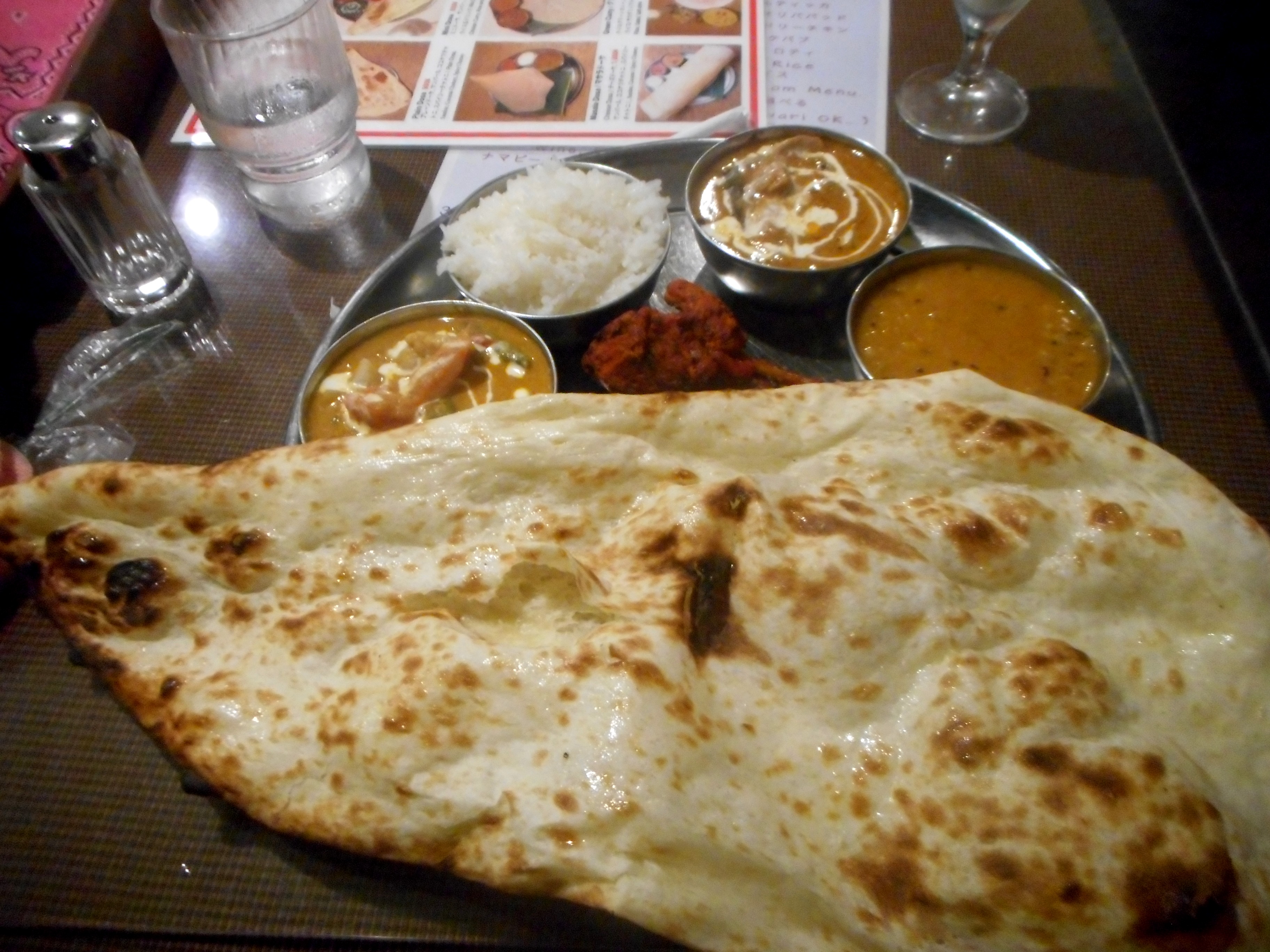ナンが、トレイからはみ出てる……。運んできたときは気づかなかったけど、どうやって運んできたんだろう……。