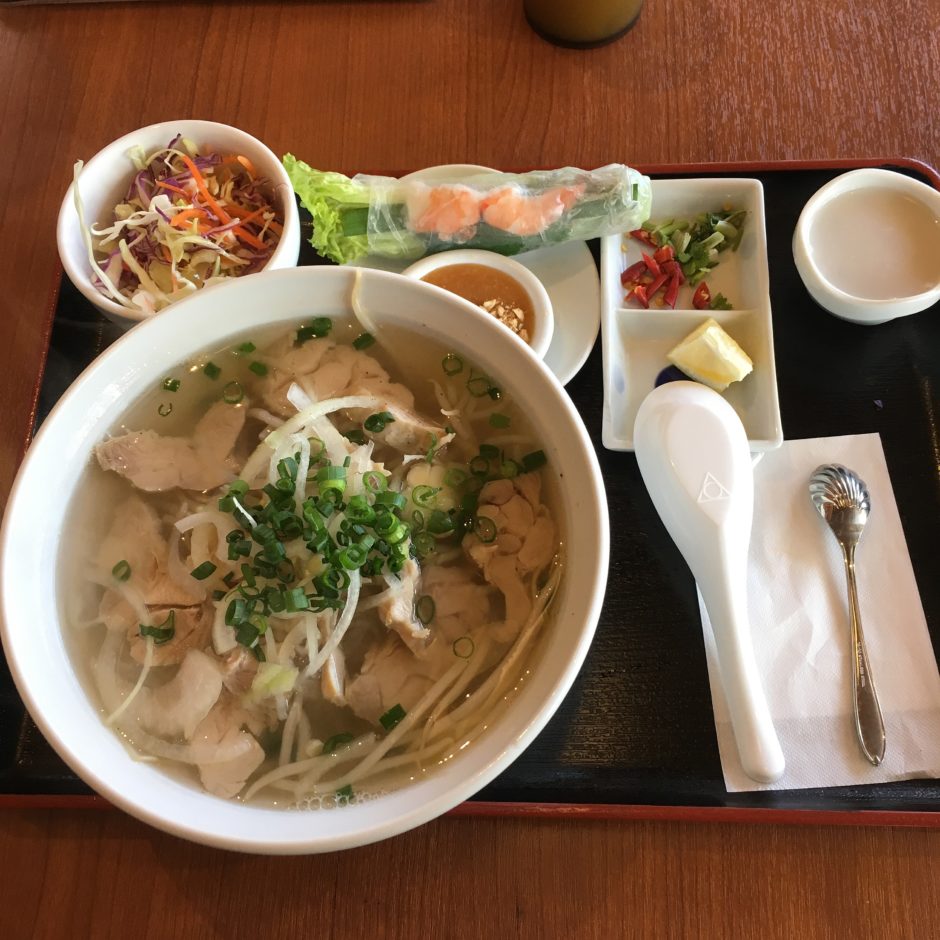鶏肉のフォー、サラダ、薬味、生春巻き、右上にあるデザート風なものは米粉を溶かして作った液体に寒天が入ってます。