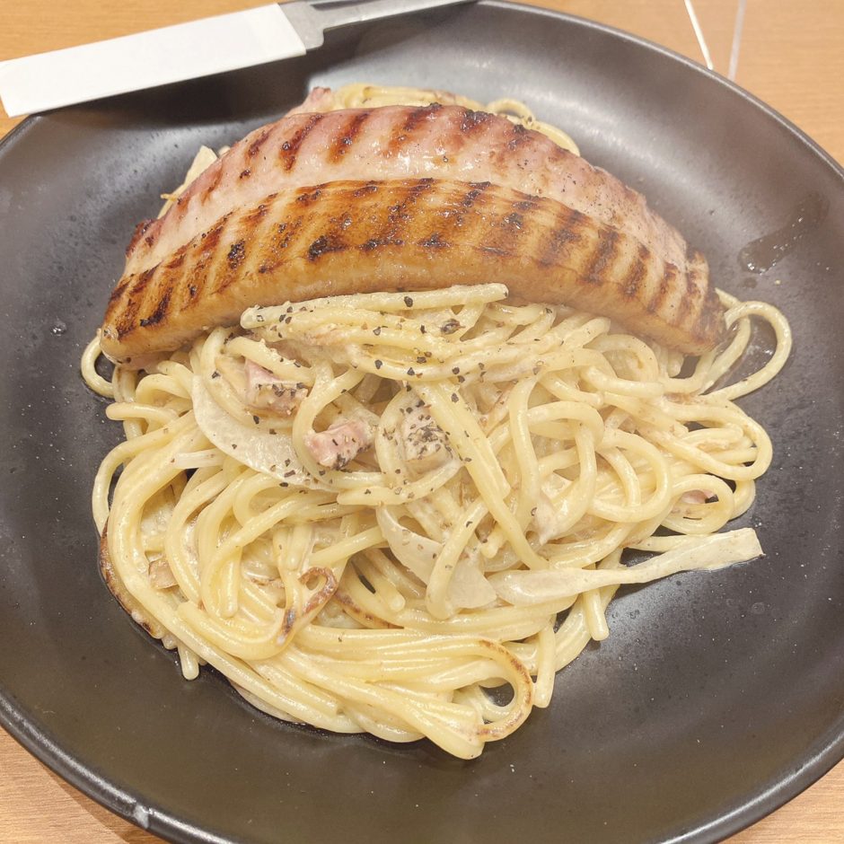 イメージではカルボナーラって卵黄が乗ってたり、生クリームや牛乳で少しドロっとというか、お店によっては下に液体っぽくなっているところもあったりしますが、こちらのカルボは甘さがあまりなく、ベーコンや胡椒が聞いてて食べ応えのある印象です。