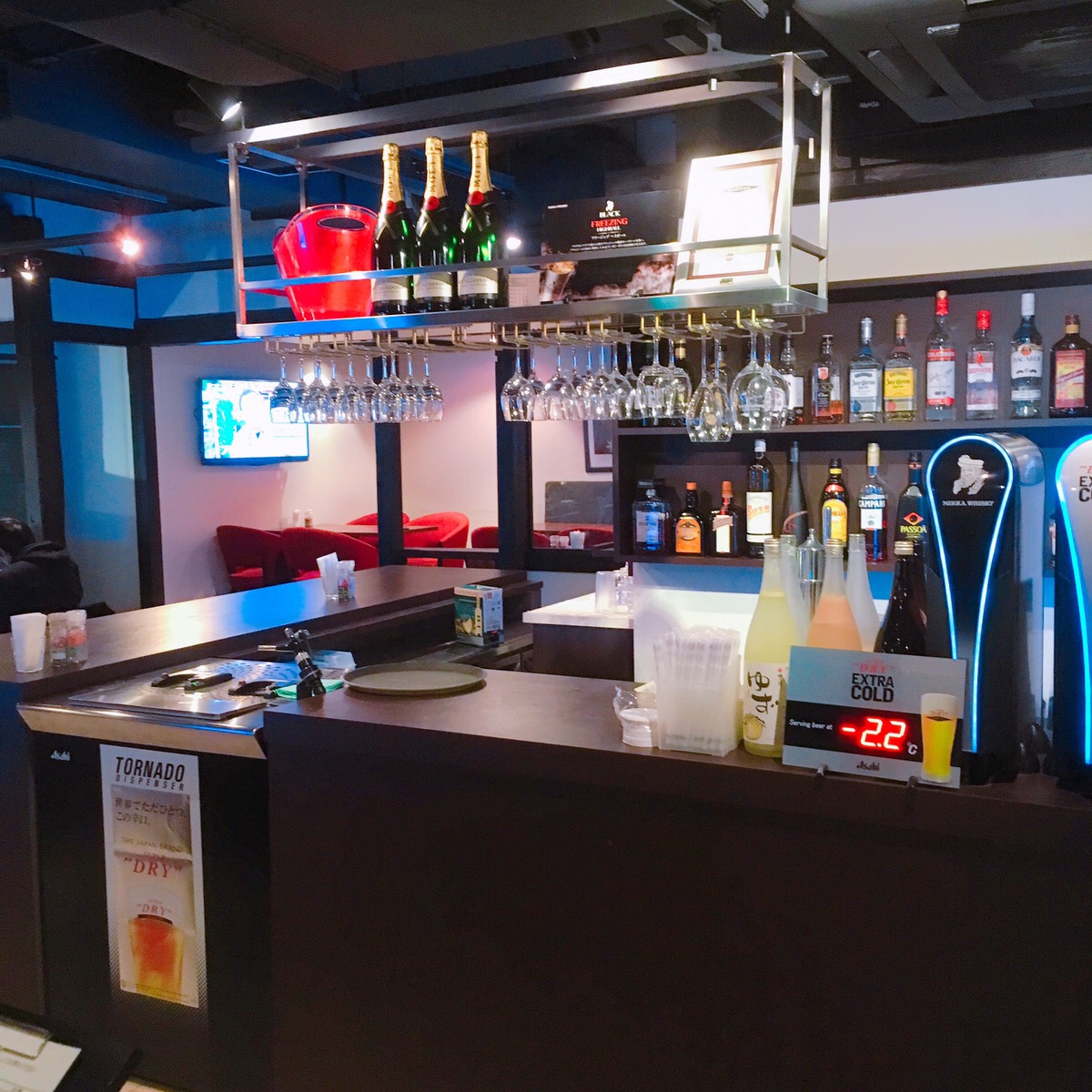 ホテルの建物とは思えぬ木扉を開けると、中はオシャレに仕上がっていて、BARのようなカウンター席とテーブル席、小上がり席が奥に続きます。